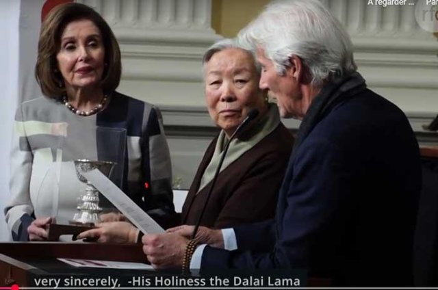 9 décembre 2024 : Richard Gere, au nom du dalaï-lama, remet sa récompense à l’ancienne Présidente de la Chambre des Représentants, Nancy Pelosi (capture d’écran d’une vidéo de Radio Free Asia https://www.youtube.com/watch?v=ePaJFgy1YXU)9 décembre 2024 : Richard Gere, au nom du dalaï-lama, remet sa récompense à l’ancienne Présidente de la Chambre des Représentants, Nancy Pelosi (capture d’écran d’une vidéo de Radio Free Asia https://www.youtube.com/watch?v=ePaJFgy1YXU)