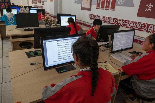 Travail sur ordinateur dans une école secondaire du Tibet. L’écran à gauche affiche un texte en caractères tibétains, l’écran à droite un texte en anglais. (Photo : Albert Ettinger, juin 2019)Travail sur ordinateur dans une école secondaire du Tibet. L’écran à gauche affiche un texte en caractères tibétains, l’écran à droite un texte en anglais. (Photo : Albert Ettinger, juin 2019)
