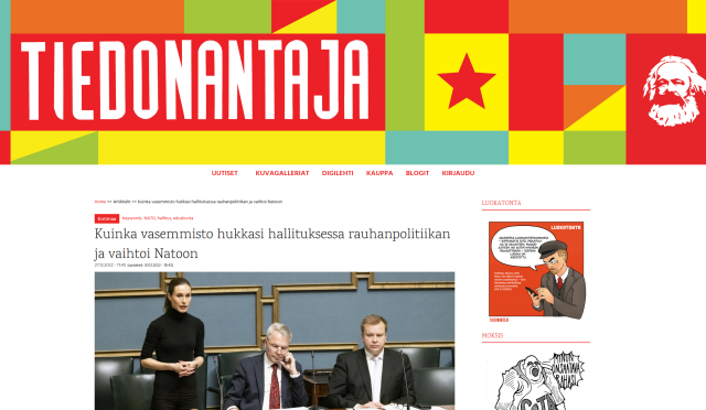 Même si une large majorité dans les sondages et au parlement soutient l’adhésion à l’OTAN, le mouvement pacifiste a toutes les raisons de poursuivre sa politique de longue date. L’expansion de l’OTAN n’est pas le courant dominant du monde, mais une réaction désastreuse à l’échec de la construction d’un système de sécurité européen post-guerre froide. La politique de guerre a besoin d’une opposition pacifiste, d’une courageuse remise en question du discours de guerre, de la dissuasion nucléaire, du militarisme et de la haine du Russe. Elle est également nécessaire au parlement, où il n’y a pas un seul parti qui s’oppose à l’OTAN et à la course aux armements. C’est pourquoi il est important que pour les élections législatives du printemps prochain, le SKP (parti Communiste de Finlande) rédige des listes de candidats comportant les déçus de la gauche gouvernementale.