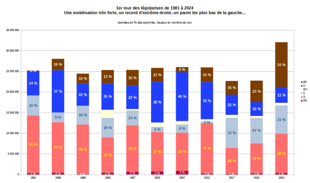 Oui, la gauche a gagné 2 millions de voix dimanche dernier sur 2022, à 9 millions, mais elle en rassemblait 12 millions en 2012, et même 14 millions en 1981, pourtant avec 13 millions d’inscrits en moins, soit 39% des inscrits, deux fois plus que dimanche dernier ! Qui peut faire croire aux Français que la gauche pourrait gagner dans ces conditions ?