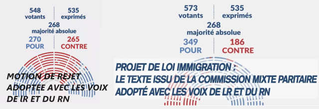 Darmanin fonce à l’ELysée présenter sa démission, que le président refuse. Il repart avec des consignes pour aboutir quelques jours plus tard au résultat final du « processus parlementaire », l’adoption d’une loi beaucoup plus dure, inspirée par les LR marchant sur les pas du RN... La loi est adoptée par 349 voix contre 186, malgré près de 60 défections dans la majorité, mais avec la totalité des députés LR et RN, 131 députés Renaissance sur 170 (20 contre). En face les 141 voix de gauche et écologistes sont unies, mais très largement minoritaires [2]. Elles ne représentent que 25% de l’assemblée...