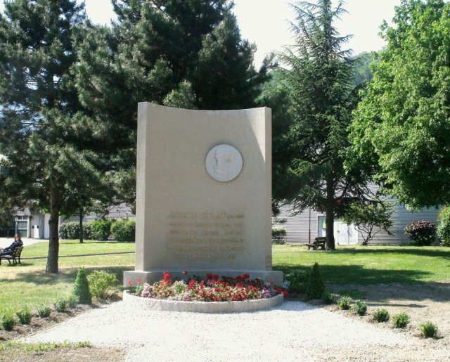 Voilà le monument en hommage à Ambroise CROIZAT après récente et entière réfection et fleurissement. Situé préalablement dans un endroit difficile d’accès et dangereux, nous l’avions déplacé (pour le 110e anniversaire de sa naissance) au cœur même de la station thermale de la Léchère, au milieu des 10.000 curistes qui, chaque année, grâce à Ambroise, enfant du pays, né à quelques mètres de la stèle en 1901, peuvent (encore...) efficacement se soigner. Un bel hommage à l’homme qui a su donner au pays le sens de la dignité. Pour l’avenir comme il le disait tout « dépendra de nos mains »...