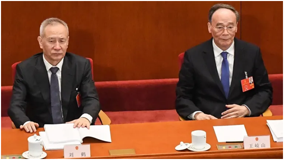 [PHOTO DESCRIPTION]A gauche, le Vice Premier ministre Liu He, à droite, le Vice-Président Wang Qishan. Jack Ma a partiellement dirigé ses critiques à Liu pendant qu’il parlait à Wang (ancien responsable de l’administration financière de la Chine durant des années). © AFP / Jiji