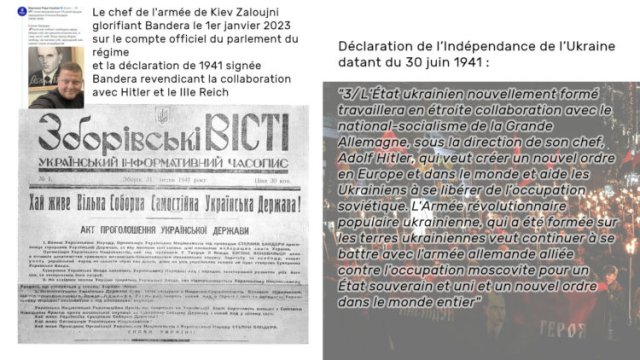 La guerre d’Ukraine a été lancée par la Russie après huit ans d’agression ukraino-occidentale (2014-2022) contre les russophones de l’Est ukrainien. Leurs 14 000 morts, en majorité des civils, avaient intéressé nos grands médias aussi peu que ceux d’Irak, de Serbie, d’Afghanistan et de Syrie, attaqués, depuis 1991, par les États-Unis en quête mondiale de contrôle pétrolier et gazier et autres matières premières, sous couvert de l’OTAN soumis à commandement unique américain depuis sa fondation (1950). La coalition occidentale, qui a d’emblée ridiculisé l’objectif officiel russe de « dénazification » annoncé en février 2022 – conforme aux « principes politiques » inscrits dans le Protocole de la Conférence de Potsdam (1er août 1945) [1] ‑‑, affirme agir contre la Russie au nom de la « démocratie » (nouveau nom du « Monde libre » de l’époque soviétique) ‑‑ . La guerre se prolongeant, l’« Occident » fait évoluer le concept de « démocratie » et « couvre » la vénération de l’État ukrainien « allié » pour ses criminels de guerre et d’avant-guerre. Ainsi érige-t-il le nazi ukrainien Stepan Bandera (1909-1959) en héraut de l’« indépendance ukrainienne » : léger défaut qu’il lui pardonne autant qu’à la « démocratie » ukrainienne post-Maïdan la promotion des groupements nazis et les coups de gourdin que le multi-millionaire Zelenski, digne successeur du milliardaire Porochenko, administre au peuple ukrainien : destruction du code du travail, des horaires aux salaires, et interdiction des partis et journaux d’opposition, requis par les « investisseurs » états-uniens.
