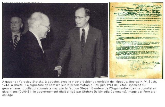 Dès juillet 1944, juste avant l’entrée de l’Armée rouge à Lvov, les massacreurs du « Conseil suprême ukrainien de libération » (UHVR) avaient, prélats compris, traité, sous l’aile romaine, « avec les gouvernements occidentaux ». Les alliés-rivaux anglais et américains collaborèrent avec les groupes dirigés, d’une part, par Bandera-Stetsko (80% des effectifs ukrainiens des « camps de personnes déplacées en Australie, au Canada, en Grande-Bretagne, aux États-Unis et autres pays occidentaux à la fin des années 1940 ») et, d’autre part, par Lebed et le prélat uniate Ivan Hrinioch, agent de liaison avec le Vatican [21].