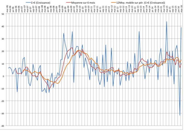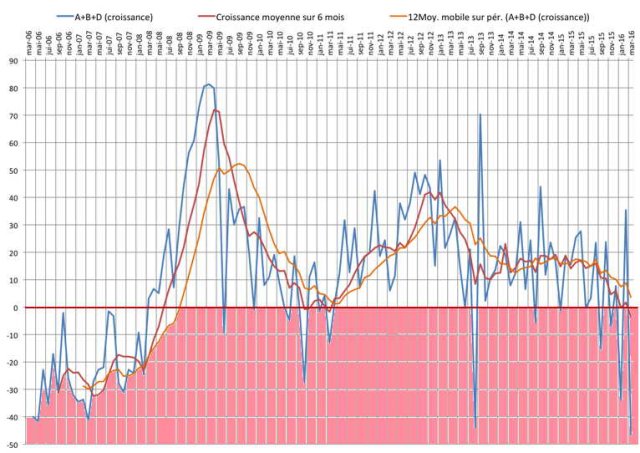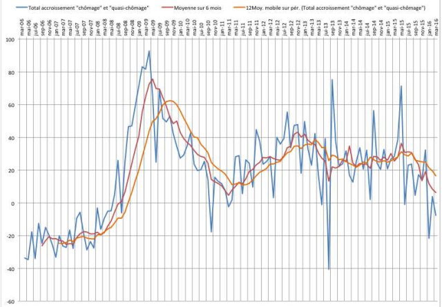 Si l’on s’attache uniquement aux chiffres des demandeurs d’emploi en métropole, on constate que ce chiffre, pour le mois de mars 2016 n’a pas baissé de 60.000 comme prétendu mais de 46.600. En fait, la catégorie D est restée au même niveau qu’en février à 273.000 personnes, et la catégorie B à augmenté d’environ 14.000 personnes. Rapportés aux moyennes mobiles sur 6 mois et 12 mois, chiffres qui sont importants car ils contribuent à « lisser » des données mensuelles pour éviter que l’on ne soit victime d’un accident statistique dans un sens ou dans un autre, on constate que la moyenne mobile sur 6 mois est de - 3000 (donc une très faible diminution) mais que la moyenne mobile sur 12 mois est de + 4000 (soit une très faible augmentation des demandeurs d’emplois). On dira alors que même si les chiffres ne sont pas ceux qui ont été annoncés, il y a néanmoins une légère amélioration, surtout sur les 6 derniers mois.