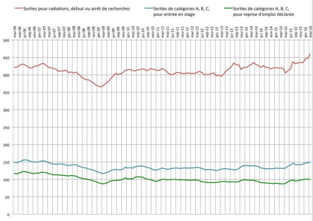 Il faut alors regarder les raisons de cette baisse. La DARES ne fournit des chiffres que pour les catégories ABC. On peut les regrouper en trois catégories. La première, est la plus importantes, correspond aux reprises d’emploi déclarées. Le nombre de ces « reprises » est resté stable sur les 3 derniers mois à 100.000 personnes. En fait, on constate bien une augmentation sur un an (de mars 2015 à mars 2016), mais cette augmentation stagne depuis janvier. La variation sur février-mars est de + 500 personnes… La seconde catégorie porte sur les entrées en stage. Il y a bien, ici, une légère augmentation puisque le chiffre de mars est en progression de + 1800 personnes. Par contre, la troisième catégorie, qui inclut les radiations administratives ou les radiations par défaut d’actualisation elle s’est accrue de + 8.800 personnes.