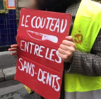 - Comment montrer la détermination individuelle et collective dans l’action ? Comment agir pour peser réellement sur les intérêts économiques du pouvoir de classe et non pas pour tenter d’obtenir un soutien médiatique illusoire ? Comment faire d’une manifestation non violente l’expression d’un réel rapport de forces ? La réponse est, en plus des "Actes" actuels, certainement dans un rôle beaucoup plus important de la grève, l’action qui pénalise le plus la bourgeoisie, qui permet l’occupation du lieu de travail, premier lieu des luttes de classe. Et pourquoi pas, pour aller vers la généralisation des grèves, porter l’idée d’une grande manifestation combative à Paris, non pas sur les grands boulevards mais sur les Champs Élysées, appelant l’ensemble de la population laborieuse à entrer dans la grève et dans l’action tous ensemble et en même temps.