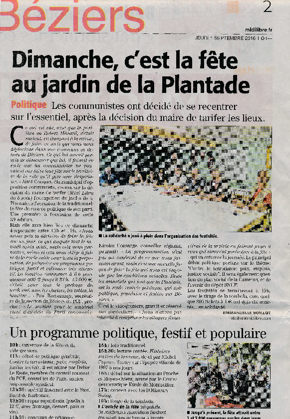 Rentrée politique des communistes du biterrois Fête de La plantade, dimanche 4 septembre 2016
