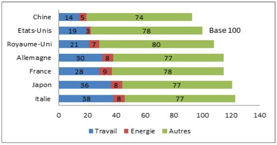 Sur le plan du coût complet de production, incluant le travail mais aussi l’énergie et les autres facteurs (coût des biens intermédiaires et des biens d’équipement), une analyse du Boston Consulting Group (BCG) [12] comparant les coûts manufacturiers de différents pays à ceux des Etats-Unis (base 100) est troublante et tendrait à montrer que l’Allemagne et la France sont au même niveau (115) et que leurs coûts manufacturiers sont meilleurs par exemple que ceux du Japon (121) ou de l’Italie (123) mais plus élevés que ceux du Royaume-Uni (108), des Etats Unis et de la Chine (93). Selon le BCG, le coût du travail serait toujours relativement moins élevé en France qu’en Allemagne.