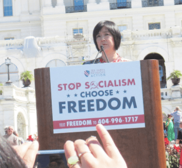 « Je ne veux plus vivre dans une quelconque sorte de socialisme » a déclaré Zeng devant la foule. « Mais ici, aux États-Unis, je commence à avoir l’impression qu’il m’a suivi ».