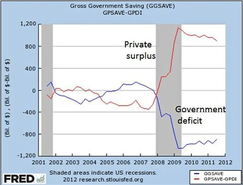 Le second montre comment endettement public et excédents privés évoluent en contre-phase :