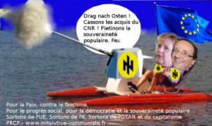 En outre, les AFFRONTEMENTS DE CLASSES ne peuvent que s’accentuer en Europe en en France au rythme de l’aggravation sans issue de la crise capitaliste surdéterminée par la crise interminable de l’euro et de la « dette ». La haine du rouge, du syndicaliste de classe, du militant de gauche anti-Maastricht, le flirt affiché et assumé d’une partie de la droite classique avec l’extrême droite, ne pourront donc elles aussi que se radicaliser à l’initiative d’une UE-OTAN qui, ne l’oublions jamais, a été programmée de A à Z pour abattre le camp socialiste, refouler la Russie soviétique, rendre le socialisme illégal en Europe (dixit Giscard d’Estaing). Les tendances à la fascisation sont donc totalement inhérentes à la « construction » européenne elle-même, cette machine à réduire les libertés démocratiques, à briser la souveraineté des peuples et à réprimer tout mouvement pouvant déboucher sur une issue socialiste.
