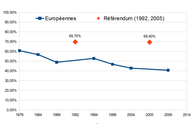 Il suffit de représenter l’évolution de la participation aux élections européennes depuis 1979 pour constater ce divorce croissant, en même temps que la capacité du peuple Français à donner son avis quand il a le sentiment qu’il a un outil pour le faire, ce qui a été le cas aux deux référendums sur l’Europe, celui pour le traité de Maastricht en 1992 et celui contre le traité constitutionnel en 2005.