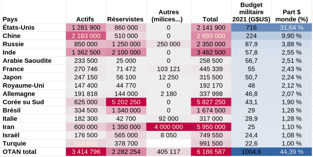 Voila le tableau des effectifs et des dépenses militaires des pays qui représentent chacun plus de 1% des dépenses militaires mondiales.
