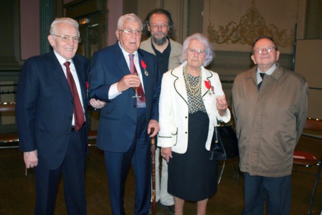Léon Landini, Georges Hage, Georges Gastaud, Jeanne Dubois-Colette (FTP du Nord, décorée à titre militaire), Henri Alleg, lors de la cérémonie de remise de la Légion d’honneur à Geo Hage à Douai.