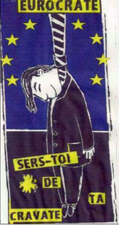 Par on ne sait quel sursaut, les populations européennes, au lieu de coller des affiches comme celle ci-dessous, qui a fleuri récemment à Bruxelles, se mettent à se réjouir de leur commune appartenance. Les budgets européens sont multipliés par quatre ou cinq (le budget européen devient de très loin le premier budget de la zone, écrasant ce lui de l’Allemagne), la Banque Centrale européenne déclare que son objectif de change est de 1 euro pour un dollar, une politique industrielle est définie au niveau européen, des écluses européennes protégeant contre le dumping social sont arrêtées (y compris contre le dumping social intra européen)...