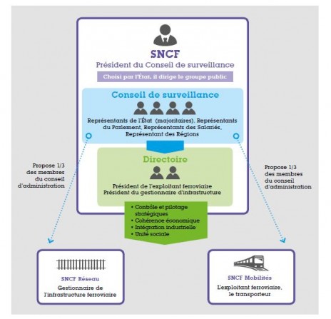 On a donc deux entreprises avec deux lignes hiérarchiques différentes et donc les dissensions qui vont avec. Avec la réforme proposée, RFF devient l’entreprise "SNCF Infra" et la SNCF devient l’entreprise "SNCF Mobilité". Ces deux entreprises se trouvent filiales d’une toute nouvelle entreprise nommée SNCF. Cette dernière est dotée d’un directoire et d’un conseil de surveillance.