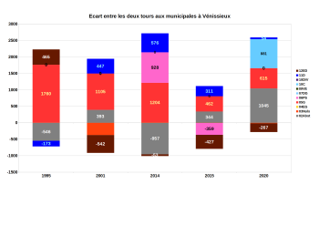 De même, l’incertitude de la bataille de 2014 mobilise tous les camps et l’abstention au premier tour progresse un peu moins à Vénissieux (+7,8%) qu’an plan national (+8,9%) et se réduit fortement au deuxième tour, avec 1000 électeurs de plus réduisant l’abstention à son niveau de 1989 en volume, 2 points de plus seulement en 25 ans contre 9 au plan national. C’est la première élection dirigée par le nouveau maire Michèle Picard succédant à André Gerin, après une législative difficile en 2012 ayant installé un député PS qui deviendra LREM. Les listes PS, UMP et FN mènent une bataille commune autour d’un slogan "80 ans de communisme, ça suffit". L’annulation tentée par la droite vient conforter en 2015 la victoire du maire communiste invalidé, mais avec une abstention de nouveau en nette hausse. Michèle Picard a gagné dans ces deux batailles électorales son statut de maire. Et en 2020, visiblement, les électeurs n’ont pas considéré que l’enjeu était de même niveau, l’abstention suit la hausse nationale. Les électeurs des listes perdantes se démobilisent entre les deux tours (1000 votants de moins) dans un vote qui se concentre sur les deux listes arrivées en tête qui progressent chacune (la gauche et les écologistes d’un coté, LREM de l’autre caché derrière une liste se présentant comme apolitique)