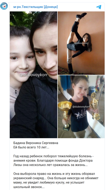 Cette petite fille s’appelait Veronica Sergueïevna Badina. Elle n’avait que deux ans quand le conflit a éclaté dans le Donbass, et faisait donc partie de ces enfants qui n’ont connu que la guerre et les bombardements de l’armée ukrainienne. Pendant plusieurs années la petite fille a souffert d’une grave anémie dont elle ne s’était remise que l’an passé grâce à l’aide de la fondation du Dr Lisa. Elle aimait les animaux et faisait de la danse sportive.