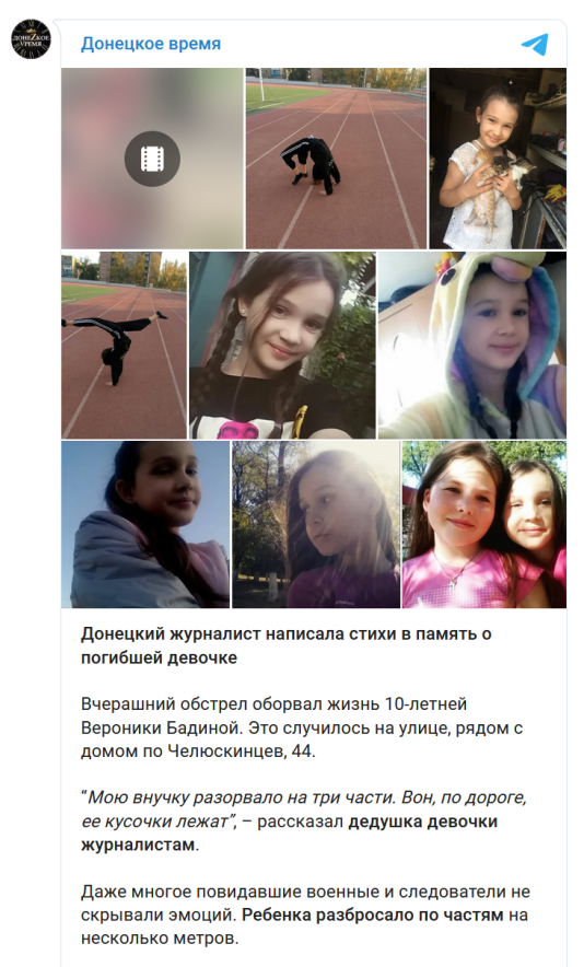 Hier, je vous rapportais qu’une petite fille de 10 ans avait été tuée par un obus standard OTAN de 155 mm tiré par l’armée ukrainienne contre le centre de Donetsk. Des détails supplémentaires sur son identité, sa vie et la façon dont elle est morte ont été publiées.