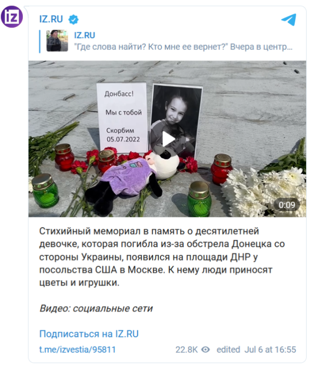 L’histoire de Veronica a touché le cœur des Russes, qui ont organisé un mémorial improvisé dédié à la petite fille devant l’ambassade américaine à Moscou. Des habitants de la capitale russe y ont allumé des bougies, et déposé peluches et fleurs, ainsi qu’une petite affiche disant « Donbass ! Nous sommes avec toi ! ».