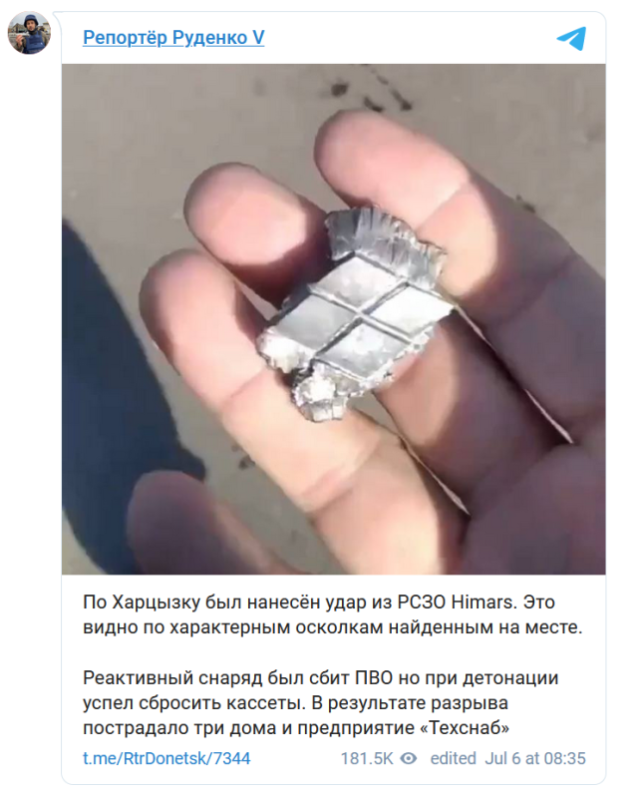Ce matin un autre bain de sang a pu être évité, lorsque la défense anti-aérienne a abattu une roquette de lance-roquettes multiple américain HIMARS tirée par l’armée ukrainienne contre la ville de Khartsyzk. La roquette a réussi à larguer ses sous-munitions, mais ces dernières n’ont fait que des dégâts matériels, sans faire de victimes parmi les civils.