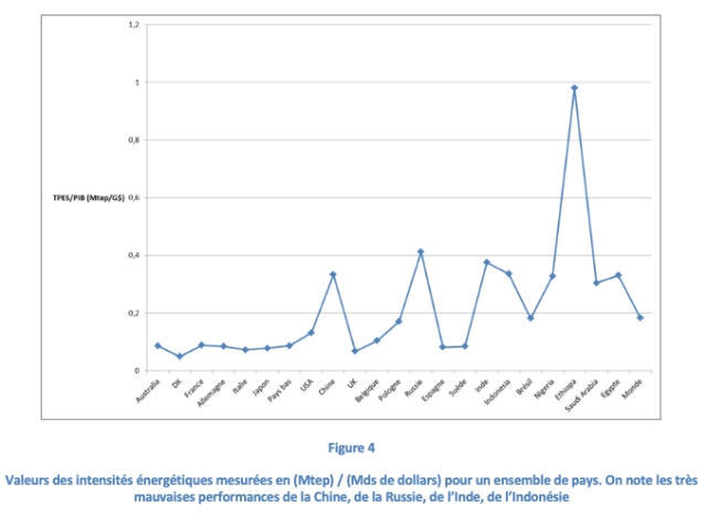 L’auteur devrait sans doute prendre en compte aussi le niveau de développement de chacun de ses pays, car bien évidemment l’Inde et la Chine, mauvais élèves, sont encore dans une phase initiale de développement, et la comparaison de l’intensité énergétique avec les USA par exemple devrait en tenir compte...