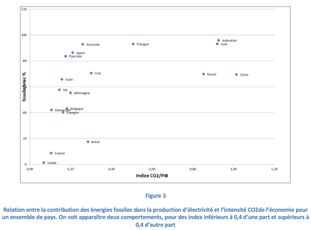 Un facteur déterminant dans l’intensité CO2 de l’économie est l’ampleur du recours aux énergies fossiles dans la production d’électricité, comme on peut le voir sur la Figure 3. Toutefois la Figure 3 laisse apparaître deux régimes :