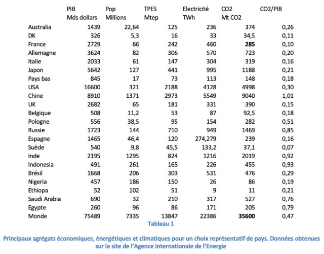 L’intensité Carbone d’une économie est le rapport entre les émissions annuelles de CO2 par une économie et la richesse qu’il produit annuellement (son PIB). Ce paramètre peut être considéré comme une mesure de la performance climatique de l’économie, une faible valeur correspondant à une bonne performance. On compare les performances des 22 pays les plus peuplés à celle du monde entier. Les valeurs de cette intensité mesurées en MTCO2/G$ s’étalent entre 0,07 pour la Suède et 1,01 pour la Chine. Pour le monde entier elle vaut 0,47. Avec une intensité de 0,1 la France se situe au deuxième rang, après la Suède. Les valeurs de l’intensité Carbone de l’économie inférieures à 0,4 sont fortement anti-corrélées avec l’importance des centrales électriques utilisant des combustibles fossiles dans le mix électrique. Si le mix électrique de la France avait été appliqué au monde entier les émissions actuelles de CO2 qui s’élèvent à 35,6 Gigatonnes auraient été réduites à 8 Gt (5 pour la Suède) et les conditions nécessaires pour limiter la hausse moyenne de la température à 1,5 °C pratiquement atteintes.