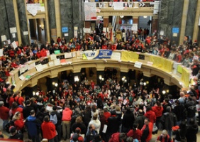 Scott Walker, gouverneur Républicain fraîchement élu entend frapper un grand coup : sous prétexte de réduire le déficit et relancer l’économie sans augmenter les impôts , il veut offrir des réductions des taxes pour les entreprises et faire payer la note aux travailleurs du secteur public. Sa ‘recette miracle’ : retirer aux syndicats quasiment toute possibilité de négocier collectivement. Une telle loi auraient des conséquences dramatiques pour les travailleurs, mais aussi pour les syndicats qui seraient amputés de leur moyens d’actions et condamnés au déclin. Un déclin qui se répercuterait sur le Parti Démocrate qui bénéficie du soutien financier et de l’influence des syndicats. Walker veut aussi réduire la contribution de l’État au Medicaid, le programme d’assistance médicale aux plus démunis et aux personnes souffrants d’handicaps.