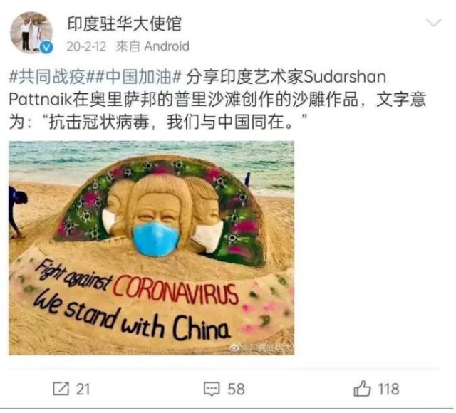Capture d’écran d’un post du compte Weibo de l’ambassade d’Inde en Chine, publié en février 2020 : Partageant la sculpture de sable de l’artiste indien Sudarshan Pattnaik sur la plage de Puri à Odisha, il est dit : « Lutte contre le coronavirus. Nous sommes aux côtés de la Chine ».