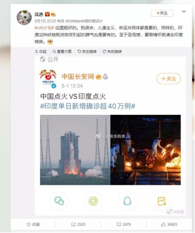 Un post du compte Weibo de la Commission politique et juridique chinoise se lit comme suit : « La Chine met le feu contre l’Inde qui met le feu », avec des images du récent lancement de fusée de la Longue Marche-8 par la Chine contrastant avec du bois de chauffage incinérant les corps de ceux qui ont perdu la vie en Inde à cause de la crise COVID-19 de l’Inde. La capture d’écran a été repartagée par Shen Yi de l’Université Fudan, qui a ajouté : « C’est une superbe image. Ne vous méprenez pas, l’humanitarisme et la « communauté pour un avenir partagé » sont tous deux nécessaires. D’autre part, l’indignation résultant des actes grossiers et bâtards de l’Inde est également nécessaire. Pour ces guerriers de la justice sociale, si vous voulez exprimer vos sympathies, allez en Inde et brûlez du bois de chauffage là-bas.