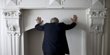 L’ancien Premier Ministre et candidat à l’élection présidentielle, Dominique de Villepin, évoquant le mythe de Sisyphe, pousse une cheminée ayant appartenue à la comédienne Sarah Bernhardt. le 29 février, dans son cabinet d’avocats à Paris. ?Se posant en pourfendeur du système, il feint ainsi d’abattre les murs et bouleverser ainsi l’ordre politique établi.