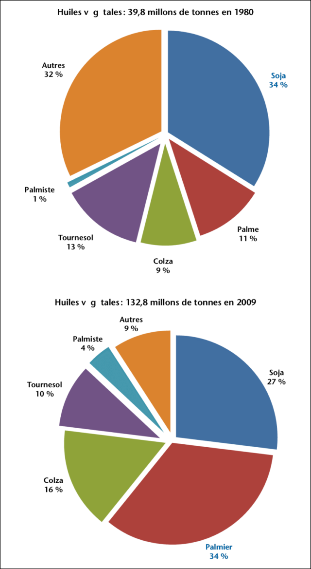(16) En 2011, la Malaisie et l’Indonésie ont produit à elles deux 36,3 % de l’offre mondiale totale d’huiles comestibles en utilisant seulement 5,5 % des surfaces plantées d’oléagineux. Ce résultat remarquable s’explique intégralement par la productivité élevée de la culture de l’huile de palme. En d’autres termes, le palmier à huile produit près de dix fois plus de matière grasse par hectare que le soja, et plus de cinq fois plus que le colza.