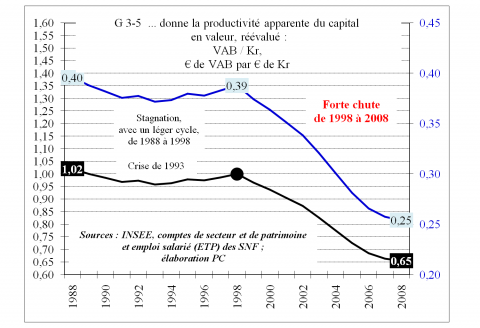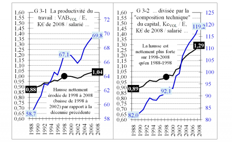 Les gains de productivité réalisés s’accompagnent de la diminution relative du travail vivant et de la plus-value qu’il produit, par rapport à l’investissement du capitaliste dans la refonte de son installation, et on a vu que cet investissement était considérable. Cet accroissement du capital constant relativement au capital variable, et que Marx définissait comme l’origine de la baisse tendancielle du taux de profit, réduit ces gains de productivité.