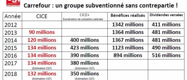 Questionnée à ce sujet, la CGT confirme que « Carrefour a touché successivement 350 millions d’euros d’aides publiques consistant en exonération de cotisations salariales et en CICE (crédit d’impôt compétitivité emploi) en 2018, 380 millions en 2017, 390 millions en 2016, 423 millions en 2015, 400 millions en 2014, soit un total de près de 2 milliards d’aide publique en 5 ans dont 744 millions au titre du CICE ! »