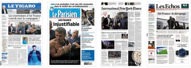 Voilà donc ce que jamais on ne lira nettement dans Libération ni dans aucun de ses semblables : que cette image des deux hauts cadres en liquette est un symptôme de plus, après beaucoup d’autres restés ignorés, d’un monde à changer d’extrême urgence. Que, faute de toute solution politique d’un tel changement, solution que des organes comme Libération se sont appliqués à empêcher d’advenir, cette image est au total porteuse d’espoir : car c’est l’image du corps social qui, par ses propres moyens, commence à sortir de son tréfonds d’impuissance, qui n’a plus peur de la tyrannie du capital. On ne lira pas non plus dans Libération que les détails de la situation n’ont pas grande importance, ni le salaire des pilotes ni l’état financier d’Air France, car, dans l’époque qui est la nôtre, l’important est le salariat qui relève la tête, quelle qu’en soit la fraction, l’exemple ainsi donné aux autres, et que ceci est un bon signe. On n’y lira pas enfin que Manuel Valls est le méta-voyou, celui qui non seulement prend le parti des voyous, mais traite de voyous les victimes des voyous.