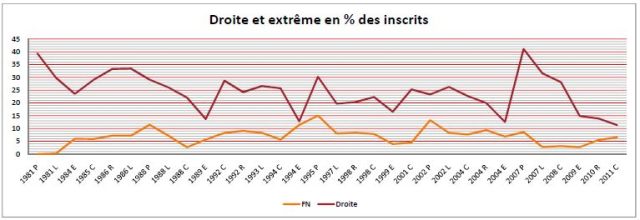 A la lecture de ce graphique on ne peut dire que l’élection de 2011 marque pour le FN un progrès par rapport à des scores antérieurs. Par contre l’effondrement de la droite fait que l’écart entre elle et le FN diminue fortement.