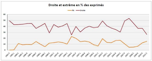 Le graphique ci-après montre l’évolution à droite en pourcentages par rapport aux exprimés aux différentes élections depuis 1981 et qui sont indiquées par la date et l’initiale (P : présidentielle, L : législative, C : cantonale, R régionale, E européenne).