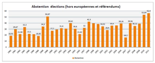 Hormis là encore la présidentielle de 2007, le record d’abstention a été battu à chaque dernière élection du type concerné. La cantonale de 2011 n’est donc pas une exception mais se situe dans la norme. A chaque élection les français votent moins.