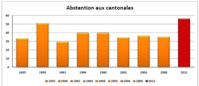 2011 a donc vu un nouveau record du PRV, « Parti des Refus de Vote » et c’est l’enseignement principal de cette élection. Il est faux d’avancer l’argument que ce taux record s’expliquerait par le fait que c’est la 1re fois qu’une cantonale n’est pas adossée à une autre élection. Si cet argument pouvait s’entendre en 1988, élection placée en septembre, donc juste après la période de juillet août peu propice à une campagne électorale, il ne peut s’entendre aujourd’hui puisque le cas s’est déjà produit en 1994 où la cantonale n’était couplée à aucune autre élection.