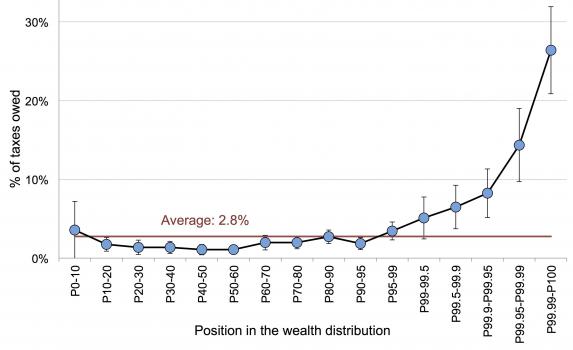 En revanche, en étudiant comment les ultra-riches se comportent dans ces pays vertueux, les auteurs réussissent à montrer une relation de causalité : plus on est riche, plus on détient de patrimoine offshore et plus on fraude proportionnellement. Sur l’ensemble des pays étudiés, les 0,01% les plus aisés cachent ainsi plus de la moitié de leur patrimoine dans les paradis fiscaux, et leur fraude représente un tiers de leurs impôts.