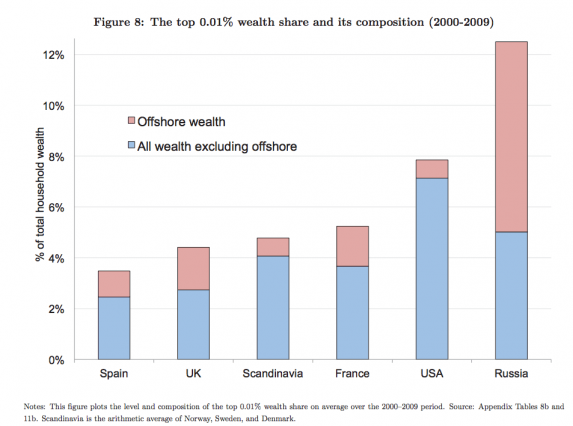 Telles sont les principales conclusions pour notre pays de l’étude « Qui détient la richesse dans les paradis fiscaux. Les preuves macroéconomiques et ses effets sur les inégalités globales », publiée par trois chercheurs dont le Français Gabriel Zucman. Ce professeur à Berkeley, en Californie, est « un bébé Piketty » : l’auteur du Capital fut en effet son directeur de thèse. Ces travaux auxquels il a contribué montrent que les inégalités de patrimoine enregistrées en France, calculées sur les données fiscales fournies par Bercy, sont massivement sous-estimées, en France comme ailleurs. Officiellement en effet, nos ultra-riches, disposent de 3,8% du patrimoine total des ménages français (de l’ordre de 10.000 milliards d’euros). Mais si l’on y ajoute le 1,4% qu’ils ont placé offshore, leur galette culmine à 5,2%, soit l’équivalent de 520 milliards d’euros.