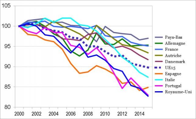 La progression du pouvoir d’achat des salaires a évidemment été freinée par la crise mais n’a pas complètement été annulée. En moyenne, ce pouvoir d’achat a augmenté de 4 % dans l’Union européenne entre 2008 et 2015. Mais ce résultat global est trompeur parce qu’il ne prend pas en compte les effets de structure : la crise a surtout détruit des emplois à plus bas salaires, et cela fait que le salaire moyen est tiré vers le haut [2]. Et, bien sûr, les salariés qui perdent leur emploi perdent une bonne partie de leur revenu. Et, bien sûr aussi, cette moyenne recouvre de grandes disparités selon les pays : là encore, il faut citer la Grèce où le recul du pouvoir d’achat atteint le record de 17 %.