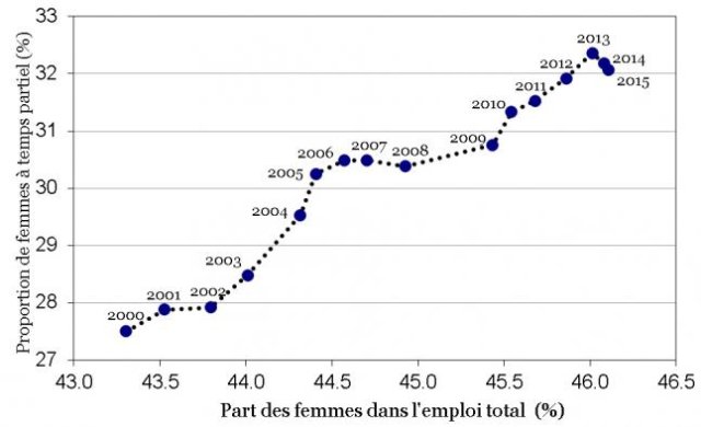 Comme les emplois à temps partiel sont majoritairement occupés par des femmes, on s’aperçoit alors que la progression du temps partiel équivaut à une autre bascule importante dans la structure de l’emploi. Entre 2008 et 2015, le nombre d’emplois à temps plein a baissé de 7,6 millions dans l’Union européenne et ce recul a été compensé à peu près pour moitié par une augmentation de 3,7 millions d’emplois à temps partiel. En même temps, l’emploi masculin a reculé de 4,7 millions alors que l’emploi féminin a augmenté de 0,8 million. La part des femmes dans l’emploi total a donc continué à progresser pendant la crise, mais cette progression a été largement conditionnée par celle du temps partiel (voir graphique 2). La crise a ainsi réaffirmé et généralisé la « fatalité » du temps partiel pour les femmes