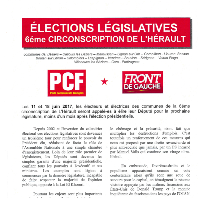 Signé par 626 communistes de 66 départements, dont 15 départements avec plus de 10 signataires, présenté au 37e congrès du PCF comme base de discussion. Il a obtenu 3.755 voix à la consultation interne pour le choix de la base commune (sur 24.376 exprimés).