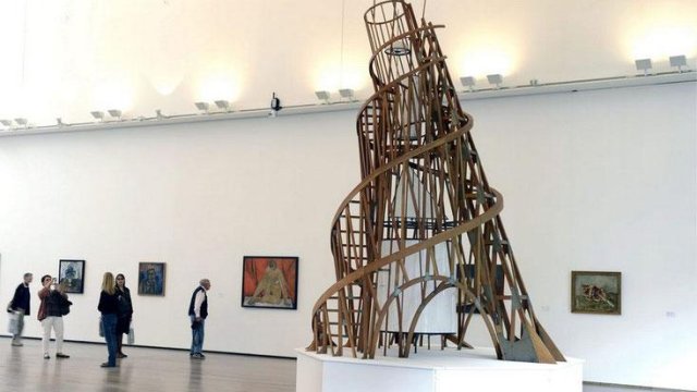 Spirale symbolisant le matérialisme dialectique. Projet de la Tour Tatline, pour un immeuble de la Troisième Internationale à Léningrad (1919). Maquette exposée au misée Tinguely de Bâle lors d’une exposition dédiée à Vladimir Tatline en 2012
