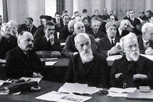 Vladimir Vernadski (à droite) lors d’une session de l’Académie des Sciences de l’URSS