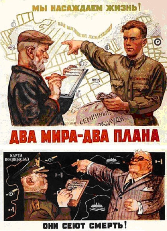 Deux pays : deux plans / Nous semons la vie, ils sèment la mort ! Affiche soviétique 1950, faisant la promotion du grand plan de transformation de la nature (1948-1952), premier plan d’agroécologie à grande échelle.